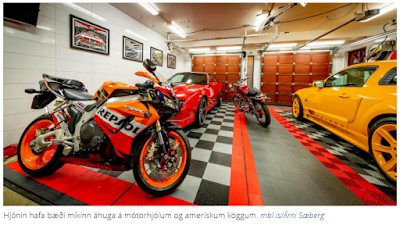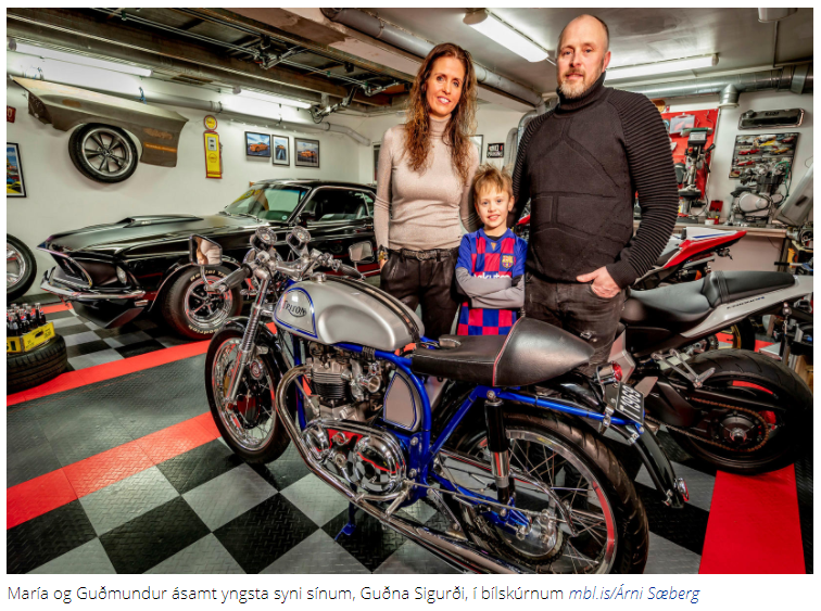 Guðmundur og María eru samrýnd hjón og kallaði það ekki á neinar samningaviðræður að fá að hafa bílskúrinn eins og hann er. Bæði eru hjúin með bíla- og mótorhjóladellu og áður en börnin komu til sögunnar mátti oft sjá þau Guðmund og Maríu á spani á mótorhjóli um landið, hann við stýrið og hana aftan á. Í dag eru þau líklegri, þegar veðrið er gott á sumrin, að halda af stað með hjólhýsi í eftirdragi eða einfaldlega taka rúnt um bæinn á einum af köggunum sem þau hafa fjárfest í. Á heimilinu eru tveir forláta Ford Mustang, Chevrolet Camaro og Porsche auk svo margra mótorhjóla að Guðmundur þarf að hugsa sig um á meðan hann telur þau fyrir blaðamann.
