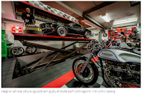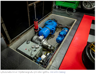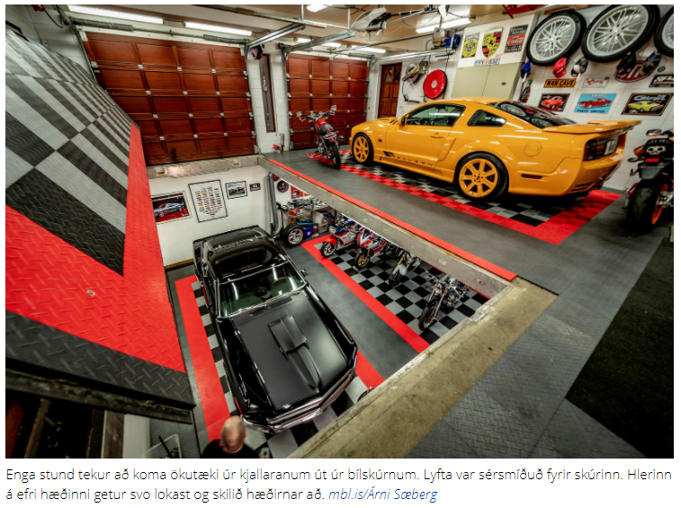 Lyftan í bílskúrnum er síðan alveg einstök, sérsmíðuð af félaga Guðmundar sem er stálsmiður. „Ég fékk skipasmíðastofu til að teikna hana upp fyrir mig og síðan var hún sett saman úr laser-skornum pörtum,“ segir Guðmundur og bendir á að hönnunin sé úthugsuð og m.a. hægt að nota lyftuna sem nokkurs konar gryfju ef vinna þurfi í undirvagni bíls. „Til viðbótar við lyftuna er lok sem leggst yfir opið í gólfinu svo að nota megi stæðið hvort sem lyftan er í efstu stöðu eða lægstu stöðu, og glussatjakkar notaðir til að hreyfa bæði lok og lyftu.“ Tekur rétt rúmlega tvær mínútur að flytja ökutæki úr kjallaranum upp í sjálfan bílskúrinn og er búnaðurinn einfaldur í umgengni, að sögn Guðmundar.