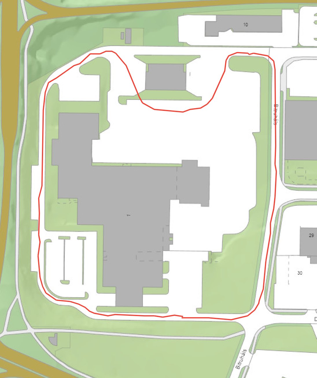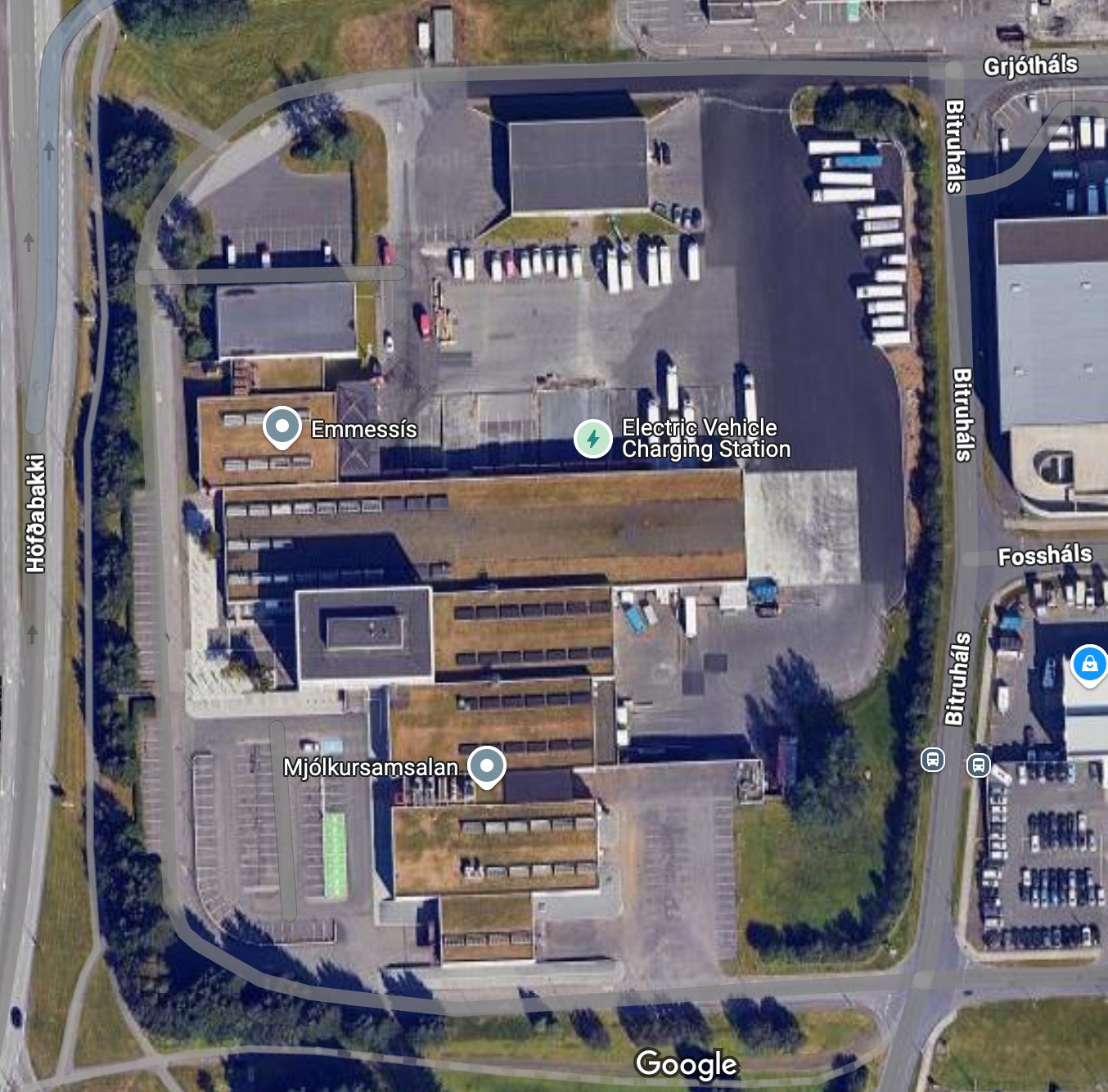 Loftmynd af Mjólkursamsölunni. Á þeim tíma sem við vorum að keyra þarna var húsið efst á myndinni ekki til staða ef ég man rétt. Alla vega var bílum ekki lagt þar og ekki búið að setja graseyjuna þar sem að nær út í sitt hvora áttina sem gerir beygjuna inn á planið ekki eins opna.