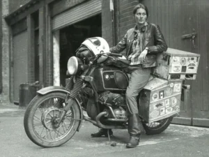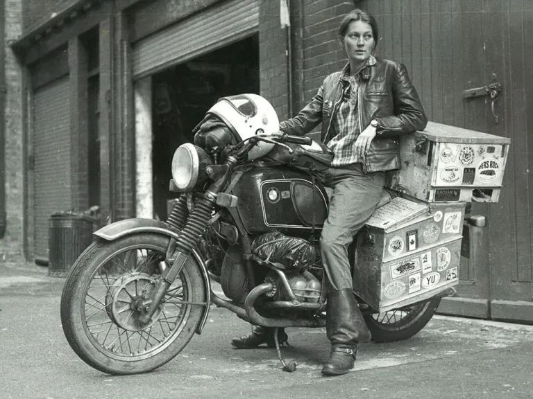Á gömlu BMW R60/6 árið 1974, hlaðnu farangri, varahlutum og eigin hugrekki, hélt hún af stað í ferð sem átti eftir að taka tvö og hálft ár og leiða hana rúmlega 56.000 km um heiminn.