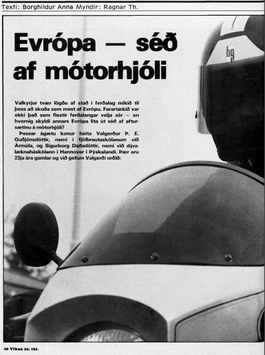 Valkyrjur tvær lögðu af stað í ferðalag mikið til þess að skoða sem mest af Evrópu. Farartækið var ekki það sem flestir ferðalangar velja sér — en hvernig skyldi annars Evrópa líta út séð af aftursætinu á mótorhjóli? Þessar ágætu konur heita Valgerður Þ. E. Guðjónsdóttir, nemi í fjölbrautaskólanum við Ármúla, og Sigurborg Daðadóttir, nemi við dýralæknaháskólann í Hannover í Þýskalandi. Þær eru 23ja ára gamlar og við gefurn Valgerði orðið: