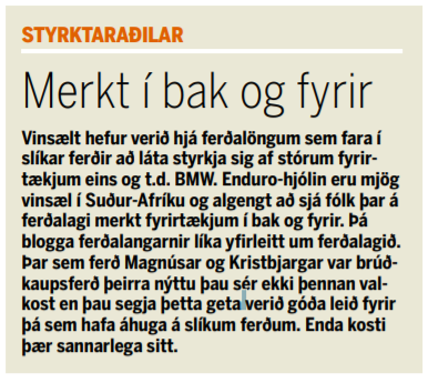 Þau Magnus og Kristbjörg eru sammála um að það sé skemmtilegur og öðruvísi ferðamáti að ferðast á þennan hátt. Enda sjái fólk allt sem fyrir augu þess ber mjög nálægt. Þau ferðuðust um á sérstaklega útbúnum enduro-hjólum. Slík hjól eru mjög vinsæl í Suður-Afríku og sérætluð í slíkar ferðir.