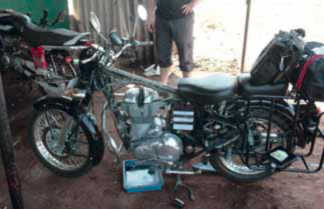 Þegar þeir félagarnir fóru að sækja Royal Enfield-hjólin bilaði eitt þeirra strax, fór ekki í gang og tók smástund að koma því í gagnið aftur. Var þeim fylgt áleiðis út úr miðborginni en þótt GPS væri með í för náðu þeir að villast strax.