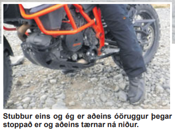 Við það að vera einum gír neðar en ég hafði verið kom krafturinn, þegar gefið var í kom þetta flotta „greddu-hljóð“ úr mótornum og minnti þetta mig einna helst á sjálfan mig þegar ég var undir 10 ára aldri og hugðist fara með veturgamlan hrútinn í fyrsta skipti í tilhleypingar. Eins og bóndinn á næsta bæ setti ég spotta í hrútinn og opnaði grindina, það skipti engum togum, hrúturinn var margfalt kraftmeiri en ég réði við. Hékk í spottanum og réði ekki við allan þennan kraft í sprækum hrútnum. Svipað gerðist þegar ég gaf þessu KTM 1090 hjóli, hjólið er einfaldlega kraftmeira og sprækara en ég, gamli kallinn, sem var að reyna að stjórna því og átti fullt með að halda mér á hjólinu, enda skilar þessi mótor 125 hestöflum.