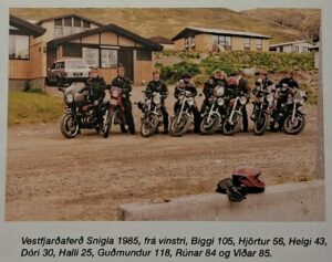 Að vera í Sniglunum búandi í litlu sjávarþorpi á Vestfjörðum gat verið erfitt, en að fá Sniglafréttir nokkuð reglulega var tengingin við aðra mótorhjólamenn og mótorhjólasamfélagið. Um veturinn 84-85 stakk ég upp á því við Óla “Mótorskussu” að Sniglar færu í Vestfjarðaferð á Tálknafjörð í kring um 17. júní, þessi hugmynd var samþykkt og gistu þeir sem komu að sunnan í húsinu hjá mér, en þetta var mín fyrsta Sniglaferð. Sniglar komu til mín, fín ferð sem skilur eftir góðar minningar. Seinna um sumarið var farin stór ferð á vegum Snigla sem var hringferð í kring um landið og var lagt af stað á laugardegi helgina fyrir Verslunarmannahelgi.
