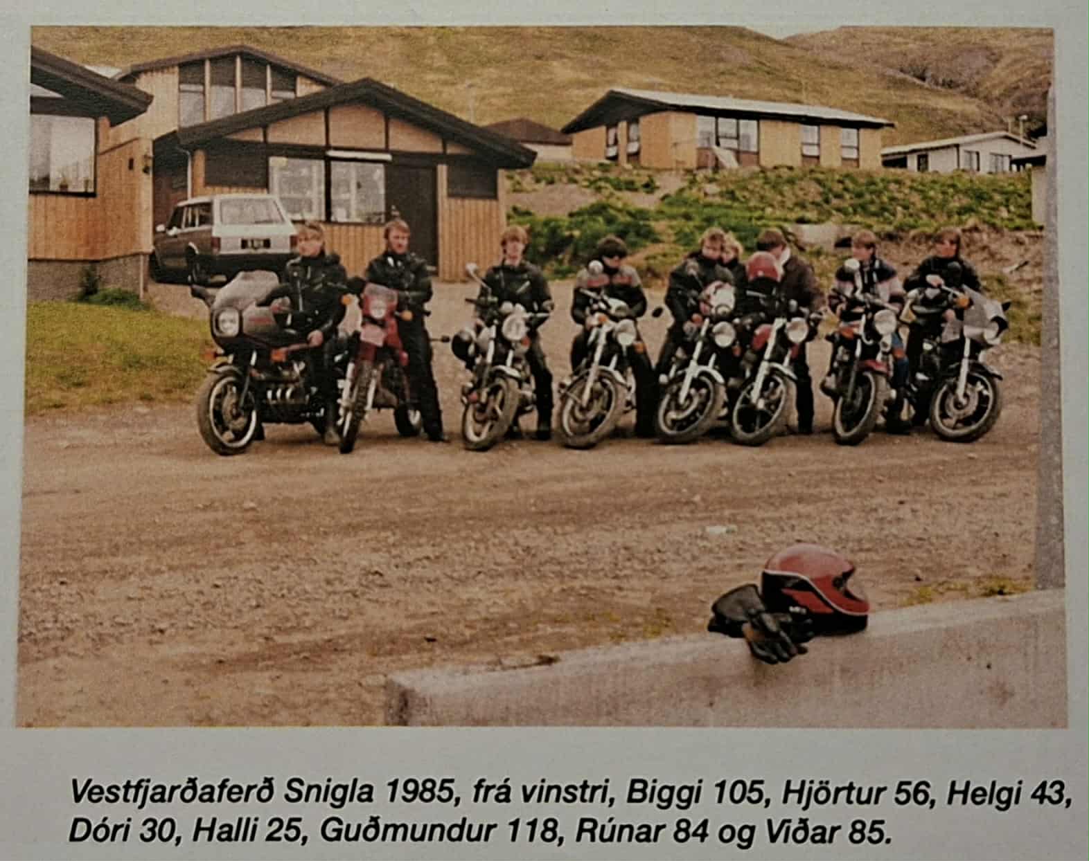 Að vera í Sniglunum búandi í litlu sjávarþorpi á Vestfjörðum gat verið erfitt, en að fá Sniglafréttir nokkuð reglulega var tengingin við aðra mótorhjólamenn og mótorhjólasamfélagið. Um veturinn 84-85 stakk ég upp á því við Óla “Mótorskussu” að Sniglar færu í Vestfjarðaferð á Tálknafjörð í kring um 17. júní, þessi hugmynd var samþykkt og gistu þeir sem komu að sunnan í húsinu hjá mér, en þetta var mín fyrsta Sniglaferð. Sniglar komu til mín, fín ferð sem skilur eftir góðar minningar. Seinna um sumarið var farin stór ferð á vegum Snigla sem var hringferð í kring um landið og var lagt af stað á laugardegi helgina fyrir Verslunarmannahelgi.