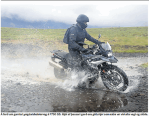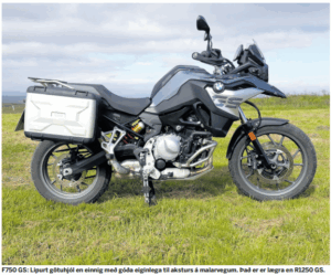 og enduro. Nógu löng til að ferðast á malarvegum og slóðum af hóflegri skynsemi en hefur ekki alveg sömu færni og lengri fjöðrun við erfiðar aðstæður. Á móti kemur að hjólið situr lægra sem er afskaplega vel þegið fyrir lappastutta. Það er ánægjulegt að finna hvað hjólið svarar vel og auðvelt að þræða milli hola og steina á malarvegum. Þannig er hægt að keyra sig í kringum skortinn á slaglangri fjöðrun í einhverjum tilfellum. Sérstaklega var gama að keyra hjólið standandi við þessar aðstæður og stýra með fótunum. Í enduro-stillingu leyfir spólvörnin smá spól sem dugar til að láta afturhjólið skríða út og hjálpa til við að stýra. Annars grípur tæknin inn í og stoppar skrið og spól. Fjölhæft mótorhjól, auðvelt í akstri og stór skemmtikraftur sem býr í litla frænda. Allar sömu stillingar eru í boði eins og í stærra hjólinu. Það helsta sem mátti finna að hjólinu er vel þekkt einkenni þessarar mótorgerðar í formi titrings á hærri snúningi sem leiðir upp í handföng. Smá fingradoði að byrja í lokin. Þetta hjól er í raun með 853 cc motor en af einhverri ástæðu kallað 750. BMW markaðssetur líka dýrari útgáfu sem heitir F850 GS. Það eru tekin 95 hestöfl út úr þeim mótor og hjólið er með lengri fjöðrun en 750 útgáfan