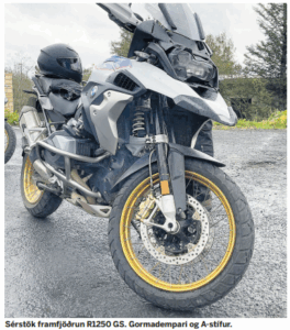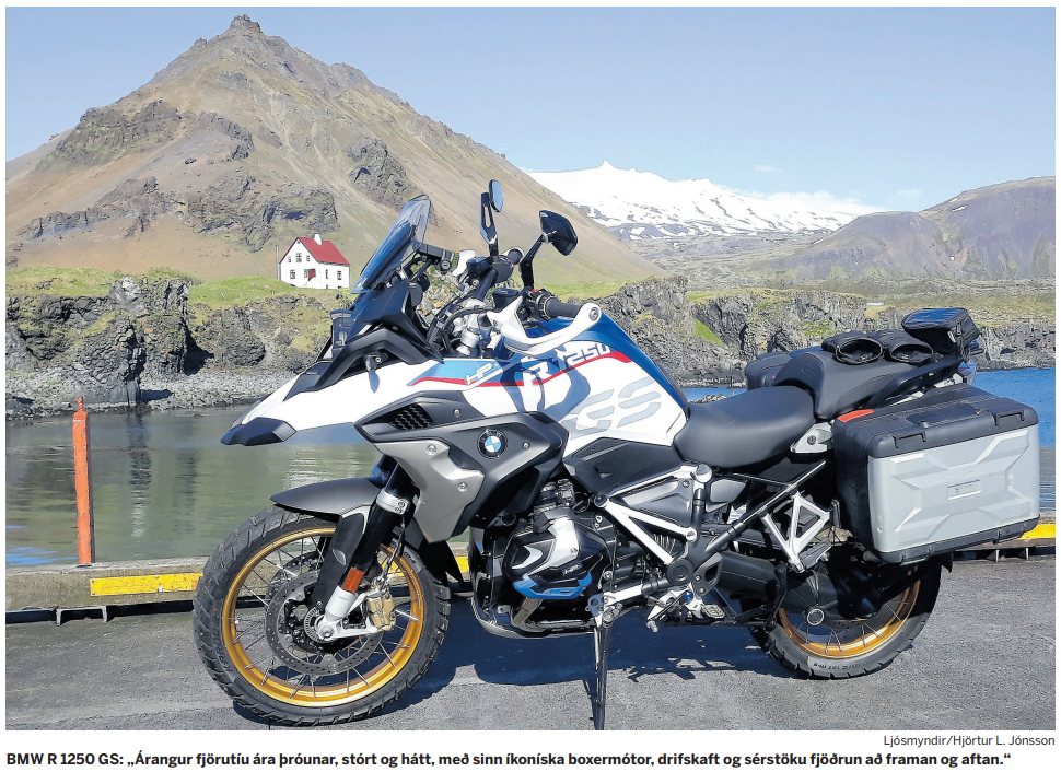 Fljótgert er að venja sig á stóra R1250 GS-hjólið frá BMW og erfitt að gagnrýna mikið. Árangur fjörutíu ára þróunar, stórt og hátt, með sinn íkoníska boxermótor, drifskaft og sérstöku fjöðrun framan og aftan. Hjólið á rætur aftur til 1980 þegar R80 GS kom á markað. Sú kynslóð sem við prófuðum kom fyrst árið 2019 með aukinni tækni. Mótorinn er t.d. með breytilegri ventlastýringu sem hliðrar knastásunum eftir snúningi og breytir þannig lyftu og ventlatíma. Þetta er eitt af því sem gerir mótorinn svo aflmikinn sem hann er á lágum snúningi og mjúkan í svörun en samt með fullt afl á hærri snúningi. Ýmislegt gert til að halda upp á 40 ára afmælið.