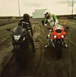 Frá Borgarnesi var haldið rakleiðis suður í Kapelluhraun í Hafnarfirði, en þar skildi spyrnt við bensínhjól. Marchel valdi öflugasta hjólið úr kerrunni (145 hö/215 Nm) og mótherjinn var ekki af minni gerðinni; Suzuki Haybusa. Skemmst er frá því að segja að frá byrjunarlínu, fyrstu 200 metrana, var harla lítill munur á milli hjóla, en það var sem rafhjólið kæmist ekki hraðar og Hayabusan stakk af og var langt á undan í mark. Reynt var þrisvar sinnum, en alltaf var Hayabusan fljótari. Það er gaman að segja frá því, vegna þess hversu lítið heyrist í rafhjólinu, gat maður hlustað á vælið í afturdekki Hayabusunnar brautina á enda.